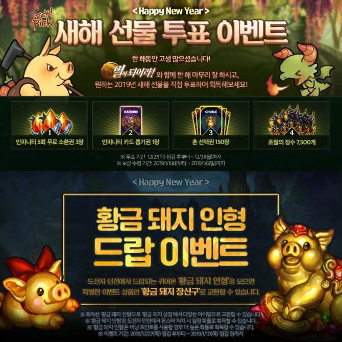 ‘선물 투표’ 이벤트’는 유저들이 가장 받고 싶은 보상에 투표를 하고 가장 많은 표를 받은 보상을 선물하는 방식이다. 인피니티 5회 무료 소환권 3장, 인피니티 카드 뽑기권 1장, 혼 선택권 150장, 초월의 정수 7500개가 후보에 올랐다. ‘초월 칼리돈’ 이벤트는 2019년 황금돼지 해를 맞아 초월 칼리돈이 황금 돼지로 변경되고 보상도 상향된다.