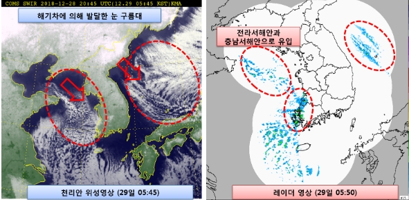 전라서해안에는 2~7㎝, 충남서해안·전라내륙에는 1~3㎝의 눈이 내릴 것으로 전망된다. 같은 날 충남 서해안·전라도는 5㎜의 빗방울이 떨어질 것으로 보인다.