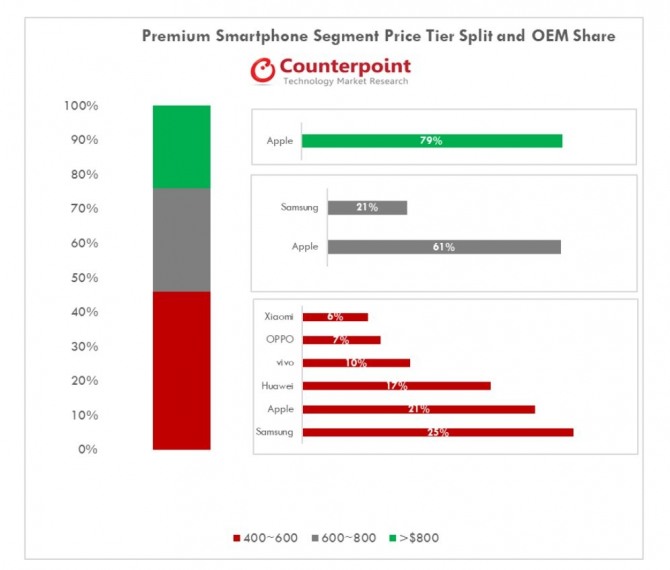 프리미엄 스마트폰 시장 1위는 애플(47%)이었고 이어 삼성전자(22%), 화웨이, 비보(5%) 등의 순이었다.
