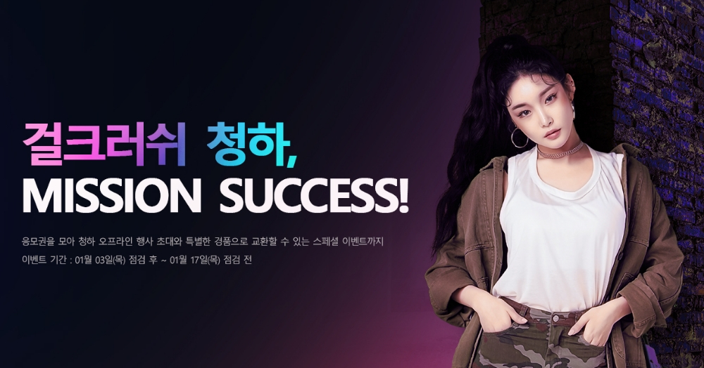 카리스마 넘치는 안무와 귀여운 매력으로 사랑 받고 있는 청하 캐릭터는 ‘걸크러쉬 폭발 댄스’ ‘애교 청하’ ‘도발 청하’ 등의 감정 표현 3종과 함께 실제 음성 효과를 지원한다. 또한, 캐릭터 사용 시 경험치 20% 증가 등 추가 기능을 갖는다.