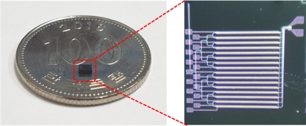 반도체 공정을 통해 광위상배열 구조로 제작된 OPA 센서는 100원짜리 동전보다 매우 작은 크기다. (사진=KAIST) 이미지 확대보기