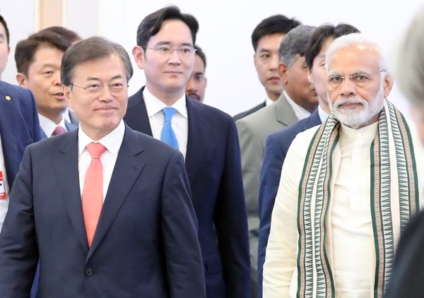 문재인 대통령과 나렌드라 모디(Narendra Modi) 인도 총리, 이재용 삼성전자 부회장이 지난해 7월 9일(현지시간) 뉴델리 인근 노이다 공단에서 개최된 ‘삼성전자 제2공장 준공식'에 참석하고 있다. (사진=뉴시스)이미지 확대보기