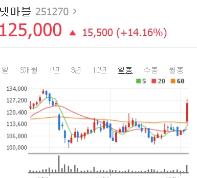 개인, 외국인 사자 폭발... 넷마블 14% 훨훨 12만 5000원