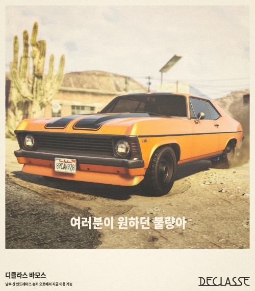 이미지 확대보기15일부터 ‘디클라스 바모스 머슬카’를 ‘남부 산 안드레아스 슈퍼 오토’에서 구매할 수 있으며, 이를 기념해 20일까지 로그인 하는 모든 유저들에게 디클라스 티를 무료로 제공한다.