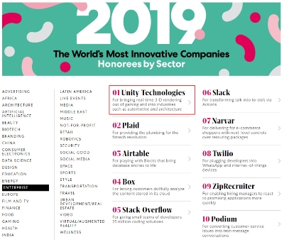 유니티는 지난해 ‘VR·AR 분야 혁신 기업'으로 선정됐고, 올해 엔터프라이즈 부문 1위, 전체 혁신 기업 50에서 18위에 선정되며 유니티 엔진의 기술적 발전과 혁신을 통해 다양한 산업 분야를 지원한 점을 인정받았다.