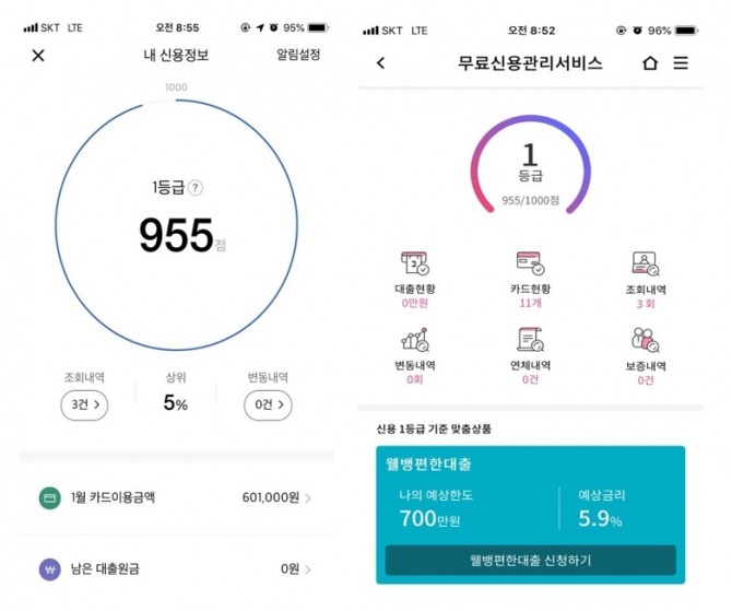 카카오뱅크(왼쪽)과 웰컴저축은행의 신용조회 서비스 (이미지=각사 애플리케이션)이미지 확대보기