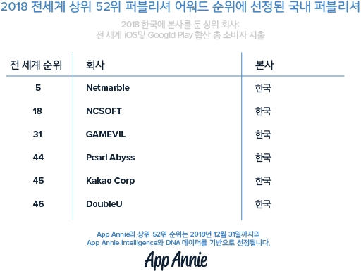 글로벌 모바일 앱 분석 업체인 ‘앱애니’가 2월 26일 발표한 ‘글로벌 상위 52대 퍼블리셔 기업’에 펄어비스가 이름을 올렸다. ‘앱애니’에 따르면 ‘글로벌 상위 52대 퍼블리셔’ 중 단일 IP로 순위에 올라간 게임 개발사는 ‘펄어비스’와 ‘Roblox’ 뿐이다.