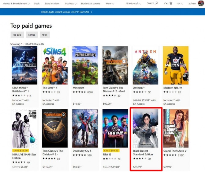 검은사막 엑스박스원 버전은 마이크로소프트 스토어에서 가장 많이 팔린 게임인 '탑 유료 게임(Top paid games)’ 차트 메인에 랭크됐다. RPG 장르에서 검은사막이 유일하다.