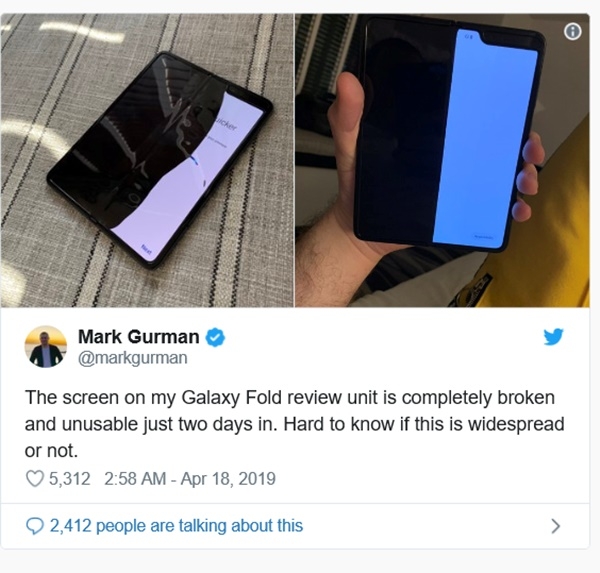 쿼츠는 17일(현지시각) 오는 26일 미국시장 출시를 앞둔 삼성전자 야심작 갤럭시 폴드가 제품 평가전문가 4인의 사용평가 결과 이같은 실망감을 주었다고 보도했다. 해당 동영상들도 함께였다. 삼성전자는 오는 26일 출시를 앞두고 선주문이 넘치는 등 수요를 따라갈 수 없게 되면서 주문을 중단할 정도로 인기를 누리고 있지만 일단 악재를 만난 것으로 보인다.