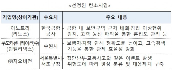 선정된 3개 컨소시엄은 총 9억2000만원의 사업비를 지원받아 우수한 지능형CCTV 기술을 실환경에 적용할 예정이다.