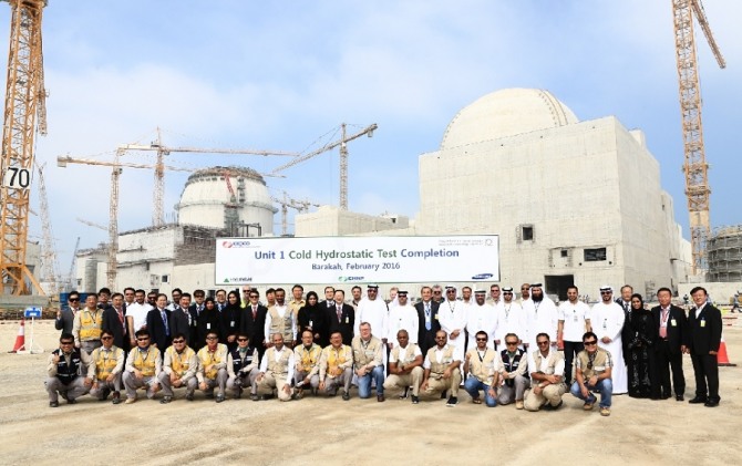 지난 2016년 2월 아랍에미리트(UAE) 바라카 원전 1호기 건설의 주요 공정인 원자로 핵심계통 건전성 시험 착수 기념행사 모습. 사진=한국전력공사