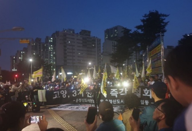 이들은 ‘3기 신도시 OUT(아웃)’, ‘3기 신도시 전면 백지화’, ‘김현미(국토교통부 장관)·이재준(고양시장) 아웃’ 등의 문구가 적힌 피켓과 깃발을 들고 시위를 벌였으며, 서명 운동도 진행했다. 오는 18일 2차 집회도 열 예정이다.