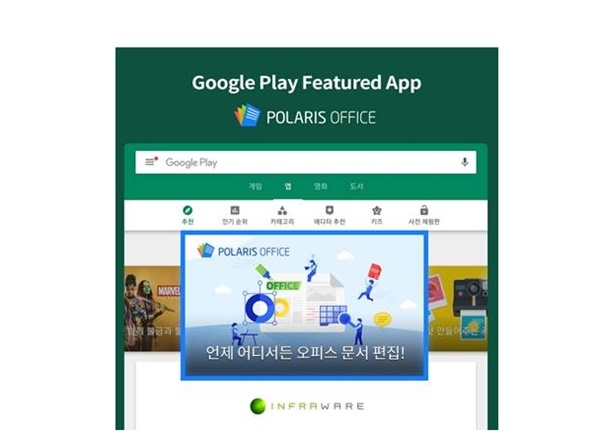 이미지 확대보기인프라웨어(곽민철·이해석·이홍구)의 ‘폴라리스 오피스’가 구글 글로벌 피처드(Google Global Featured)에 이름을 올렸다. 구글 피처드는 구글플레이 등록 앱 중 이용자 평점 4.0 이상 및 기능, 완성도 등 기준을 바탕으로 구글플레이의 검증을 거쳐 선정된다.