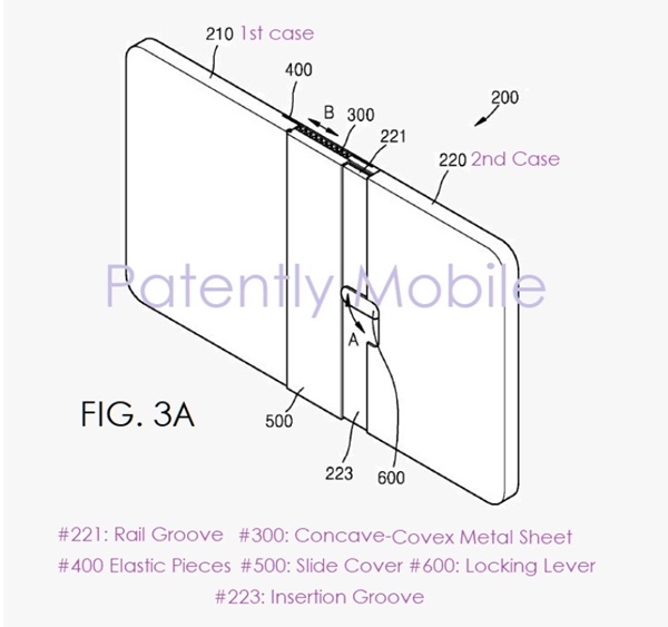 이미지 확대보기즉, 플렉시블 디스플레이 패널의 첫 번째 측면을 지지하는 케이스와 플렉서블 케이스의 두 번째 측면을 지지하는 두 번째 케이스가 포함된다. 또 첫 번째케이스와 두 번째케이스를 연결하는 힌지(경첩), 그리고 폴더블폰이 펼쳐진 상태에서 접혀진 방향의 첫 번째케이스와 두 번째 케이스의 회전을 방지하도록 구성된 잠금장치를 두고 있다.