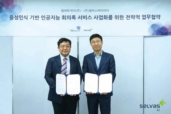 이미지 확대보기인공지능 전문기업 셀바스 AI(대표 곽민철·김경남)가 3일 국내 1위 컨퍼런스콜사업자 ‘텔레투게더(Teletogether)’와 '지능형미팅비서' 서비스 구축을 위한 업무협약 양해각서(MOU)를 교환하고 다음달부터 서비스에 들어간다고 밝혔다.