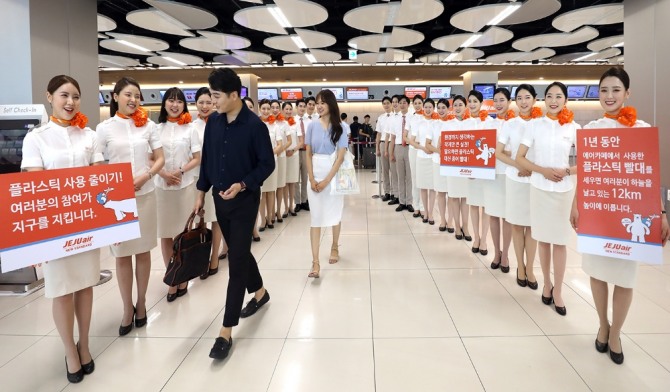 제주항공 승무원들은 환경을 지키기 위한 다양한 노력을 제주항공 승객과 함께 하기 위해 이날 오전 김포국제공항 국내선 카운터 앞에서 플라스틱 사용 줄이기 캠페인을 열었다.