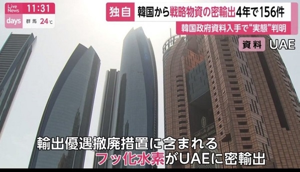 북한 김정은 국무위원장의 이복형 김정남 씨 암살 당시 사용된 신경제 'VX'의 원료가 말레이시아 등에 밀수출된 것외에 이번 일본의 수출우대 철폐 조치에 포함된 불화수소도 아랍에미리트연합(UAE) 등에 밀수출됐다.
