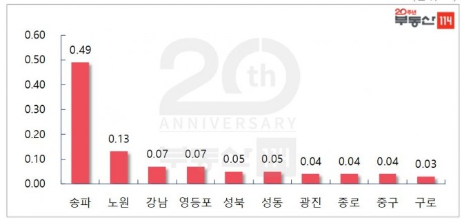 서울은 ▲송파(0.49%) ▲노원(0.13%) ▲강남(0.07%) ▲영등포(0.07%) ▲성북(0.05%) ▲성동(0.05%) ▲광진(0.04%) ▲종로(0.04%) 순으로 상승했다.