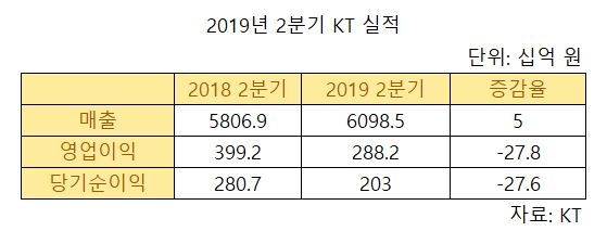이미지 확대보기7일 2분기 컨퍼런스콜에서 윤경근 최고재무책임자(CFO)는 “5G 초기 상황에서 마케팅 비용이 크게 늘면서 영업이익이 전년 동기 대비 27.8% 감소한 2882억 원을 기록했다”고 밝혔다. 당기순이익 역시 전년 동기 대비 27.6% 늘어난 2030억 원을 기록했다. 2분기 KT의 마케팅 비용은 5G 초기 가입자 유치와 유·무선 서비스 강화를 위한 비용 증가로 전년 동기 대비 1000억 원 이상(20.2%)늘어난 7116억원으로 집계됐다.