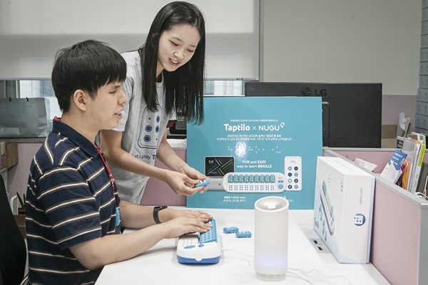 ‘스마트 점자학습 시스템’은 인공지능 스피커 ‘누구’와 점자학습기 ‘탭틸로’를 연동해, 시각 장애인이 음성만으로 점자 학습을 할 수 있는 환경을 구현한 것이다.
