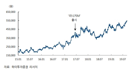 최근 주가상승의 원동력은 신작 대작게임인 ‘리니지 2M’에 대한 기대다. ‘리니지 2M’의 출시계획이 발표되며 주가도 55만2000원으로 연중 최고치를 경신하기도 했다