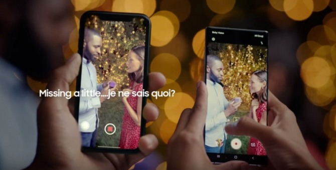 광고엔 새 아이폰과 갤럭시노트10을 갖고있는 두 사람이 똑같은 동영상을 촬영하면서 갤럭시노트10을 갖고 있는 사람은 보케(Bokeh) 기능으로 즐기는 모습이 담겨져 있다.