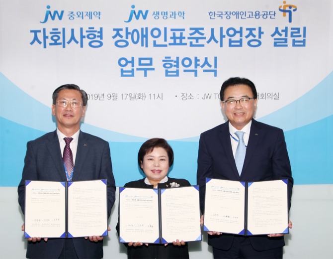 JW중외제약(대표 신영섭)과 JW생명과학(대표 차성남)은 한국장애인고용공단(이사장 조종란)과 '자회사형 장애인표준사업장 설립을 위한 협약식'을 개최했다고 17일 밝혔다.