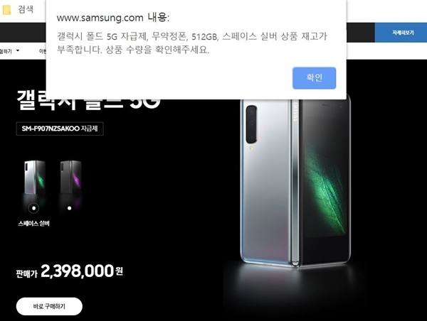 삼성닷컴 자급제 갤럭시폴드 예판이 15분만에 매진됐다. 사진=삼성닷컴 웹페이지 갈무리.