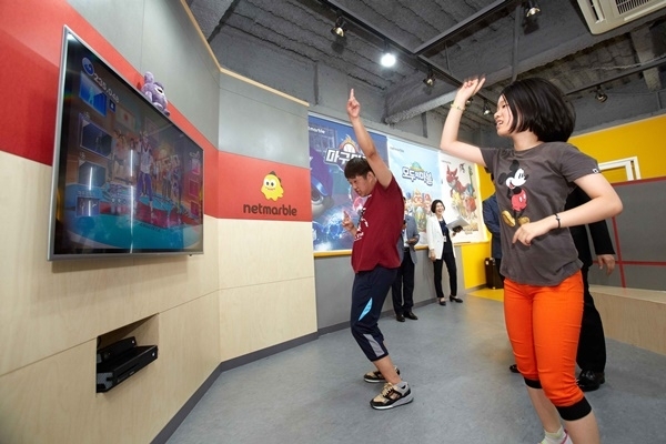 장애학생들이 게이문화체험관에서 기기를 보면서 율동을 하고 있다.사진=넷마블이미지 확대보기