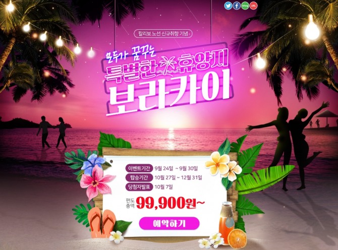 에어부산은 보라카이 신규 취항 기념으로 특가 항공권 프로모션을 실시한다. 특가 항공권은 에어부산 홈페이지와 모바일을 통해 판매되며 1인 편도 총액 기준 9만 9900원부터 구매할 수 있다. 이벤트는 오는 24일부터 30일까지이며 진행되며, 탑승 기간은 10월 27일부터 12월 31일까지다.