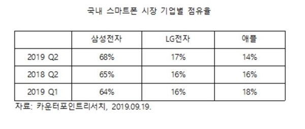 국내 스마트폰 시장 기업별 점유율.자료=카운터포인트 리서치 2019.9.19