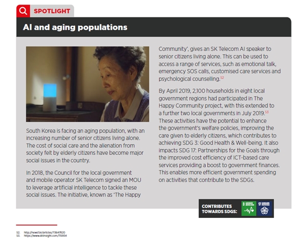 이미지 확대보기SKT는 25일 UN 총회 개막에 맞춰 발간된 2019 GSMA 리포트(2019 Mobile Industry Impact Report : SDGs)에 자사의 행복 커뮤니티 인공지능 돌봄 서비스가 우수사례로 게재됐다고 밝혔다. GSMA는 세계이동통신사업자들의 연합체로서 UN의 지속가능개발 목표(SDGs) 달성을 위한 이동통신산업의 기여와 우수 사례 등을 조사해서 해마다 발표하는데 올해로 4회째 발간됐다.