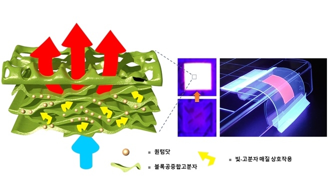 연구팀은 이 다공성 고분자 매질을 활용하면 빛과 고분자 매질의 상호작용이 극대화돼 퀀텀닷 복합소재의 광흡수도와 광추출도가 각각 4~5배씩 증가하는 것을 발견했다. 또한 블록 공중합 고분자는 수 나노미터(nm) 크기의 상분리 구조를 스스로 내부에 형성해 퀀텀닷 입자들을 고르게 분산시켜 줌으로써 퀀텀닷 간 상호작용에 의한 발광 강도 감소 현상도 크게 낮춰 준다.