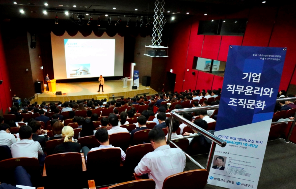 이미지 확대보기휴온스는 지난 1일 판교 글로벌 R&D센터 대강당에서 700여 명의 임직원이 참석한 가운데 국민권익위원회가 주관하는 '기업청렴경영교육'을 실시했다고 2일 밝혔다.