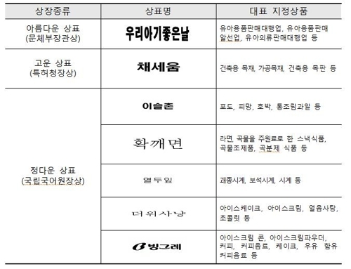 또 국립국어원장상을 받는 '정다운 상표'로 '이슬촌'(농산물), '확깨면'(곡물조제품), '열두잎'(시계), '더위사냥'(아이스크림), '빙그레'(빙과·커피음료) 등이 뽑혔다.