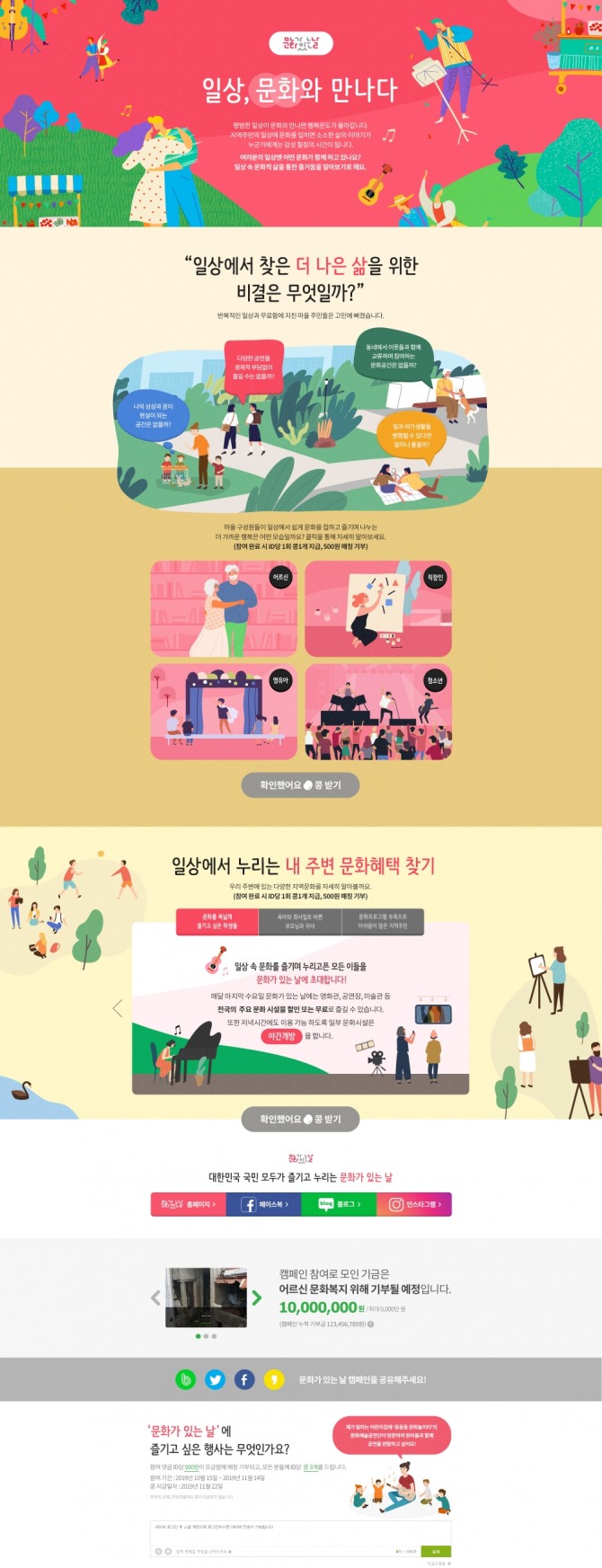 또 캠페인 페이지는 연령과 상황에 맞는 '문화가 있는 날(매달 마지막 주 수요일)' 혜택을 일러스트와 스토리텔링을 활용해 소개한다. 특히 '직장 문화배달' '동동동 문화놀이터' 등 문화가 있는 날에 열리는 다양한 프로그램 정보도 얻을 수 있다.