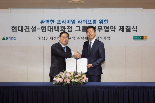이미지 확대보기17일 현대건설에 따르면, 전날인 16일 서울 종로구 계동 본사 사옥에서 현대백화점과 향후 한남3구역 재개발 정비구역 내 백화점 입점 업무 협약을 맺었다..