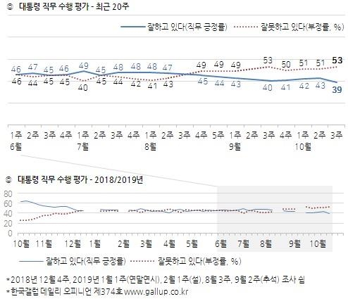 한국갤럽이 15~17일 전국 유권자 1004명을 대상으로 조사(신뢰수준 95%에 표본오차 ±3.1%포인트)한 여론조사에서 문 대통령의 국정 수행에 대한 긍정 평가는 전주보다 4%포인트 하락한 39%로 낮아졌다.