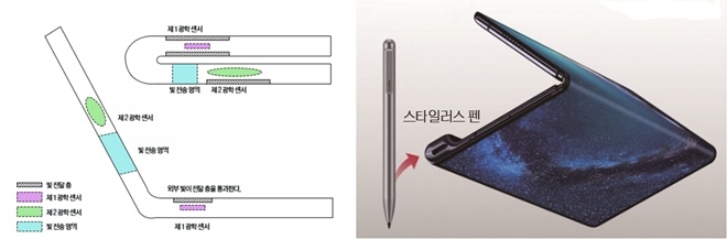 화웨이는 차기 폴더블폰 디자인으로 삼성전자의 전매특허와도 같은 전자펜(스타일러스)을 사용하는 폴더블폰 디자인 특허를 받았다. 다만 이 전자펜은 단말기 측면 윗부분에 보관했다가 빼서 쓸 수 있도록 설계돼 있다. 삼성전자 갤럭시노트의 전자펜(S펜)이 단말기 아랫부분에 저장됐다가 필요시 빼내는 것과 차이를 보인다. 화웨이는 지난 2월 WIPO에 ‘전자 기기(Electronic device)’란 명칭으로 전자펜이 들어간 폴더블폰 특허를 출원했다. 화웨이의 특허디자인은 메이트X와 시간적으로 너무 가까이 있어 차세대 폴더블폰에 스타일러스를 제공할 가능성은 낮아 보이지만 가능성을 배제할 수는 없다.