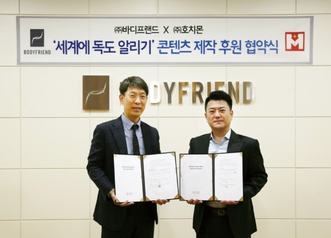 이미지 확대보기바디프랜드는 지난 22일 서울 강남구 바디프랜드 도곡타워에서 한류 콘텐츠 유통기업 호치몬과 '세계에 독도 알리기' 콘텐츠 제작 후원 협약을 체결했다고 23일 밝혔다.