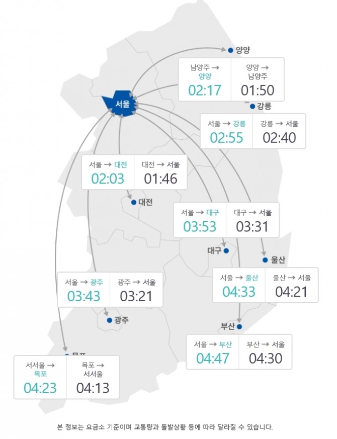 오전 11시 요금소 기준 주요 도시간 예상 소요시간은 하행선 ▲서울~부산 4시간53분 ▲서울~대구 3시간59분 ▲서울~광주 4시간3분 ▲서울~대전 2시간30분 ▲서울~강릉 3시간6분 ▲서울~울산 4시간44분 ▲서울~목포 4시간33분이다.