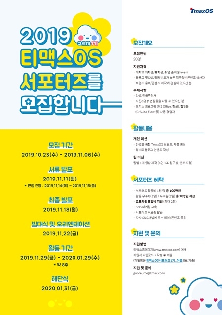 티맥스가 2019 티맥스OS 대학생 서포터즈를 모집한다. 신청서류 접수 기간은 11월6일까지, 서류발표는 11월 11일, 최종발표는 11월 18일이다.