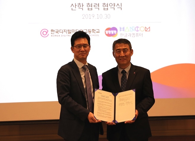 이미지 확대보기한컴과 한국디지털미디어고는 30일 경기도 성남시 한컴타워에서 김대기 한글과컴퓨터 전무와 박주현 한국디지털미디어고 교장을 비롯한 주요 관계자들이 참석한 가운데 뉴미디어 콘텐츠 전문인력 양성과 우수 콘텐츠 공유를 위한 산학협력 협약을 체결했다고 밝혔다.