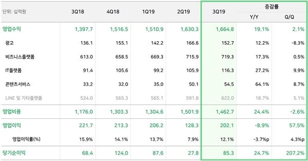 라인과 기타플랫폼은 전년 동기 대비 18.7%, 전 분기 대비 5.1% 증가한 6220억 원을 기록했다.