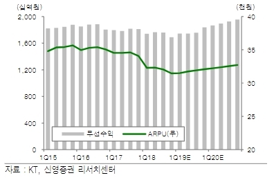 KT주가가 5G 기대에 따른 실적개선기대로 소폭 오르고 있다. KT 무선수익과 ARPU((가입자당 평균매출) 추이와 전망자료=신영증권