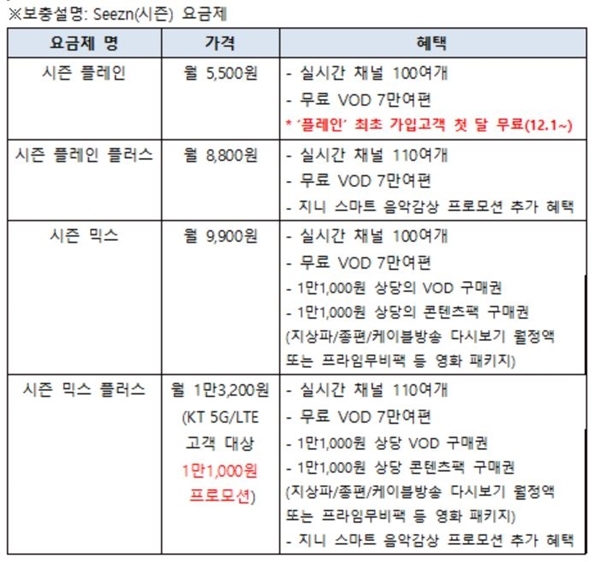 한편 KT는 시즌 출시를 맞아 KT 5G·LTE 요금제 이용 고객에게 ‘믹스 플러스’ 상품을 2200원 할인해주는 프로모션(월 1만1000원)을 진행한다. 해당 요금제에 가입하면 110여개 실시간 채널과 7만여편의 VOD, 2만2000원 상당의 유료 콘텐츠 결제 포인트, 지니뮤직의 스마트 음악감상을 모두 즐길 수 있다. 이 외에도 KT는 다양한 출시 기념 이벤트를 진행할 계획이다.