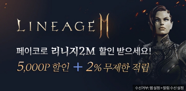 이미지 확대보기새해 1월 14일까지 구글플레이에서 '페이코'의 선불충전 재화인 '페이코포인트'를 결제수단으로 선택한 후 '리니지2M' 등 엔씨소프트 게임을 결제하는 모든 이용자는 최초 1회에 한해 5000포인트를 즉시 할인 받을 수 있다.