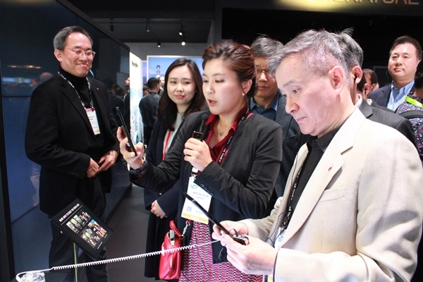올초 미국 라스베이거스에서 열린 CES2019에서 LG유플러스 하현회 부회장이 LG전자 부스를 방문해 신제품을 시연하고 있다. 사진=LG유플러스