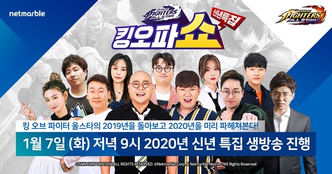 이번 방송에서는 출연진들이 지난 한 해를 돌아봄과 동시에 새해 킹 오브 파이터 올스타가 나아갈 방향에 대해서 의견을 나눈다. 특히 지난 해 많은 관심을 받았던 ‘사무라이 쇼다운’과 ‘철권’ 콜라보 업데이트 등을 비롯해 새해 업데이트와 신규 파이터 출시 계획, 그리고 킹오파쇼 시즌 6 진행 일정과 오프라인 대회 등 다채로운 이야기를 이용자들에게 전할 예정이다. 생방송 중 이용자들에게 다양한 보상을 획득할 수 있는 쿠폰도 지급한다.