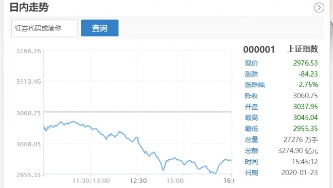 신종 코로나바이러스에 의한 '우한 폐렴'이 중국에서 급속도로 확산하면서 중국 경제 전반에 큰 타격을 줄 것이라는 우려가 커지면서 중국증시가 밀렸다.